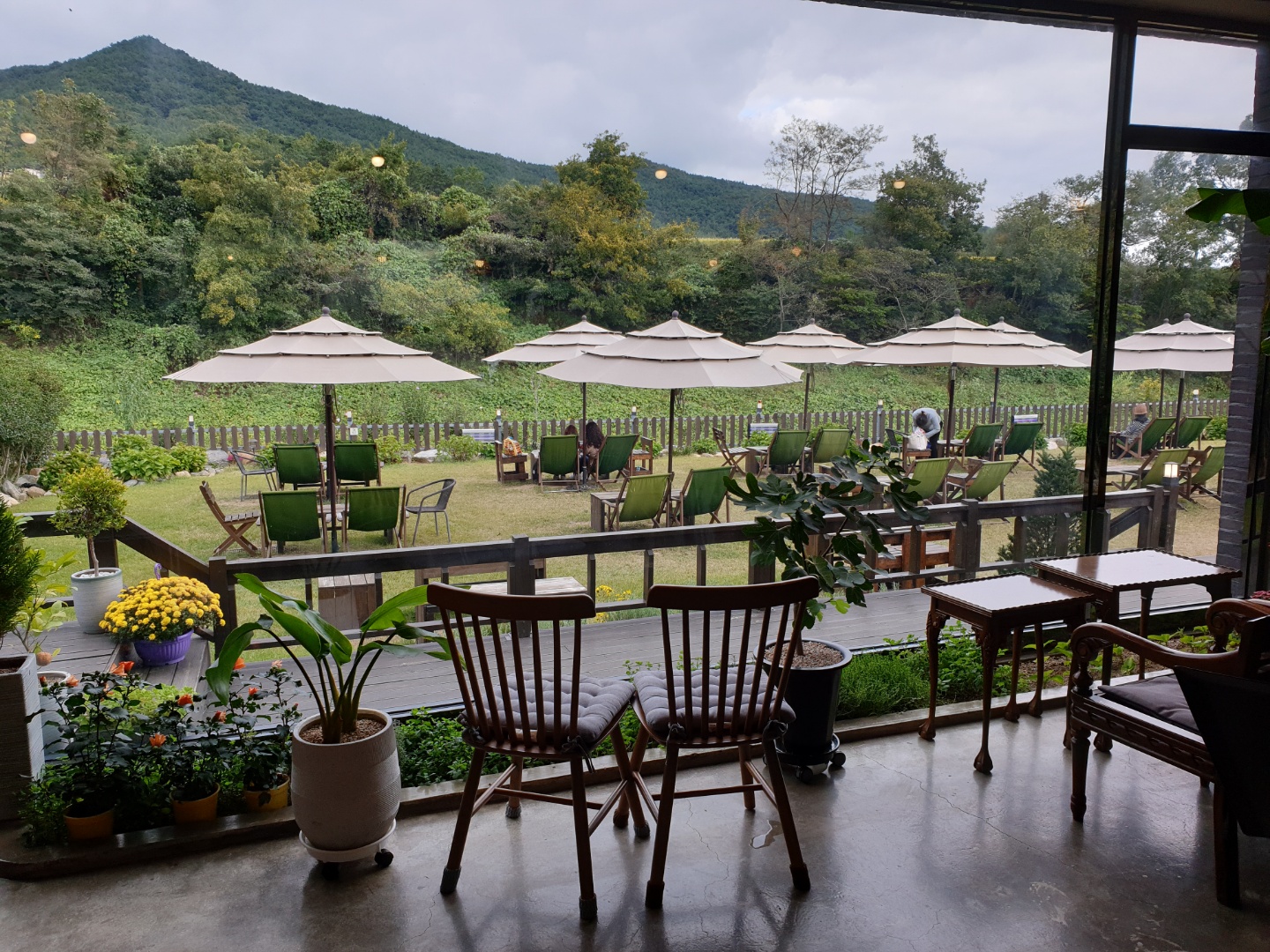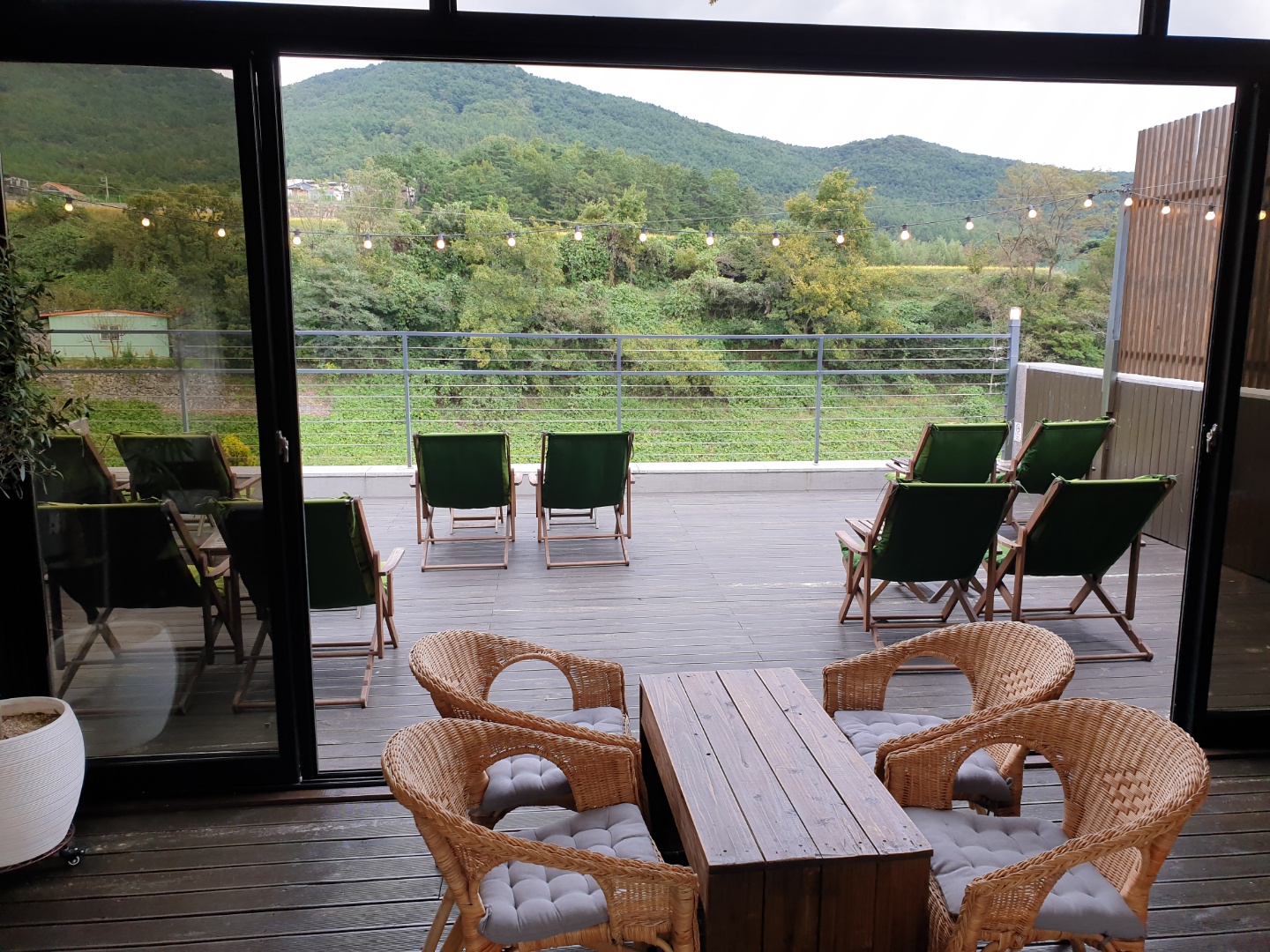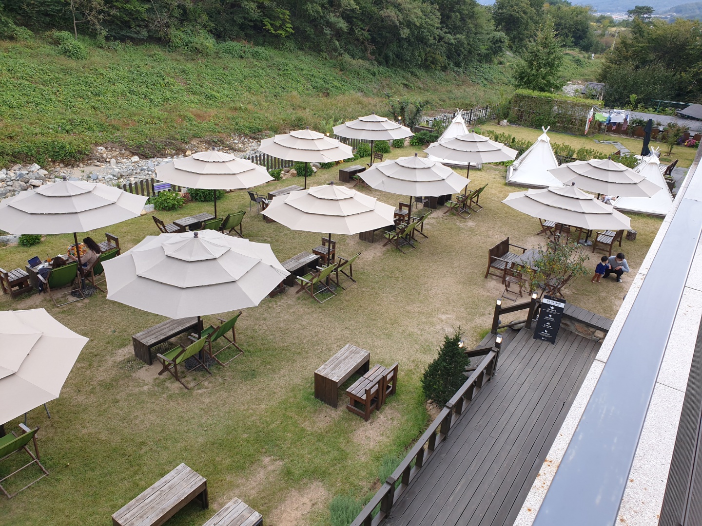 1층에서 바라본 야외 풍경입니다. 정말 아늑하고 편해보이죠? 저 야외 테이블들은 한쪽을 향해 바라보게끔 배치가 되어 잇는 거기엔 계곡이 흐르는 거 같더라구요.